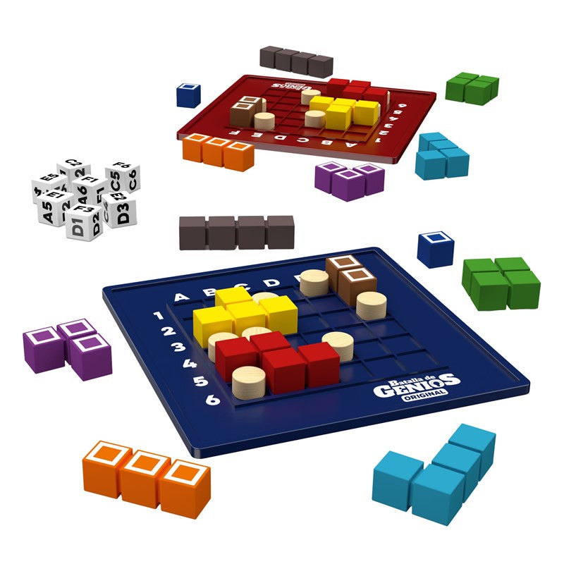 ¿Quién ganará la batalla de genios? Reta a tu oponente a completar el tablero antes que tú. ¡Sé el más rápido en resolverlo! Existen 62.208 combinaciones posibles y siempre hay una solución. Completa la cuadrícula con las nueve piezas de colores una vez que se hayan colocado los siete bloqueadores en las posiciones que indican los dados.