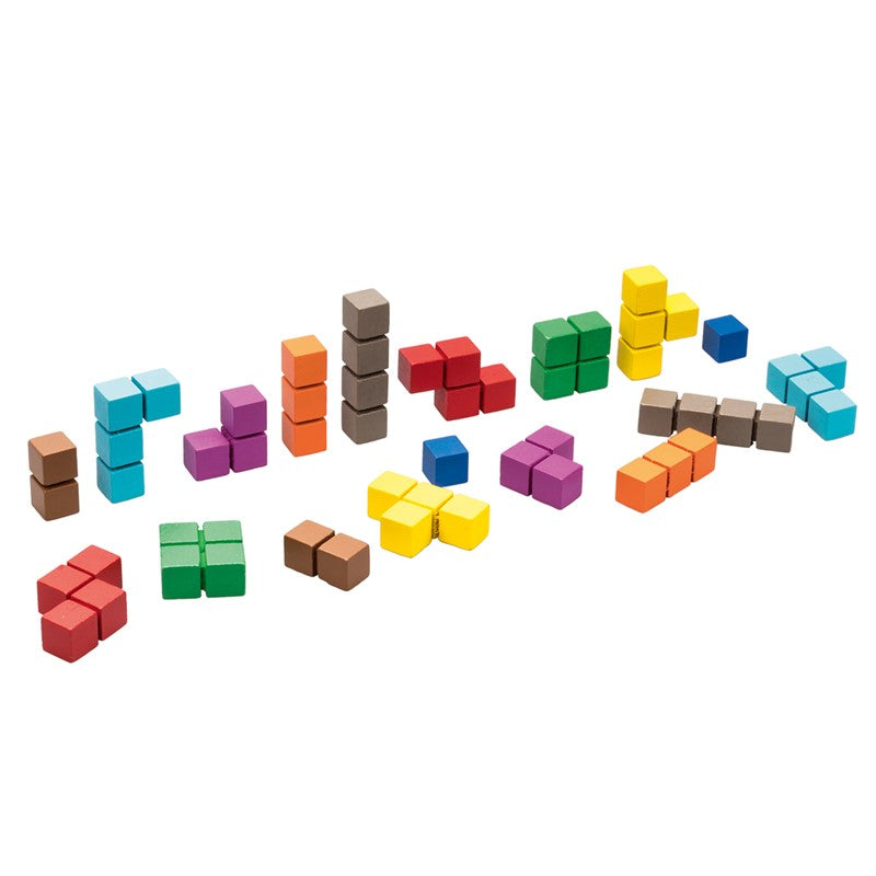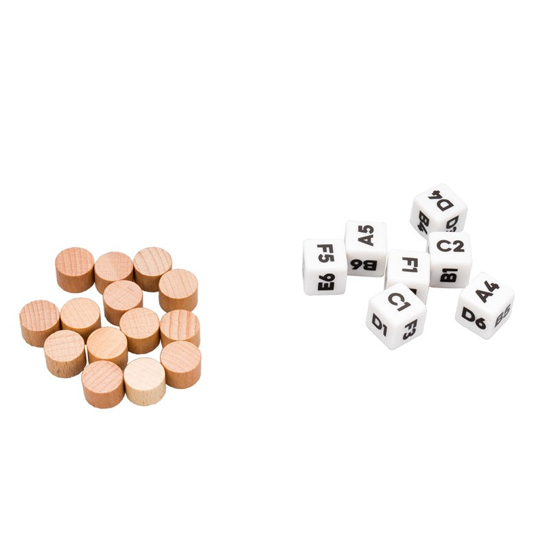 - Contenido: 18 piezas de madera, 14 piezas bloqueadoras, 7 dados, 2 tableros y reglas de juego.