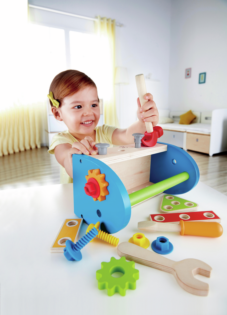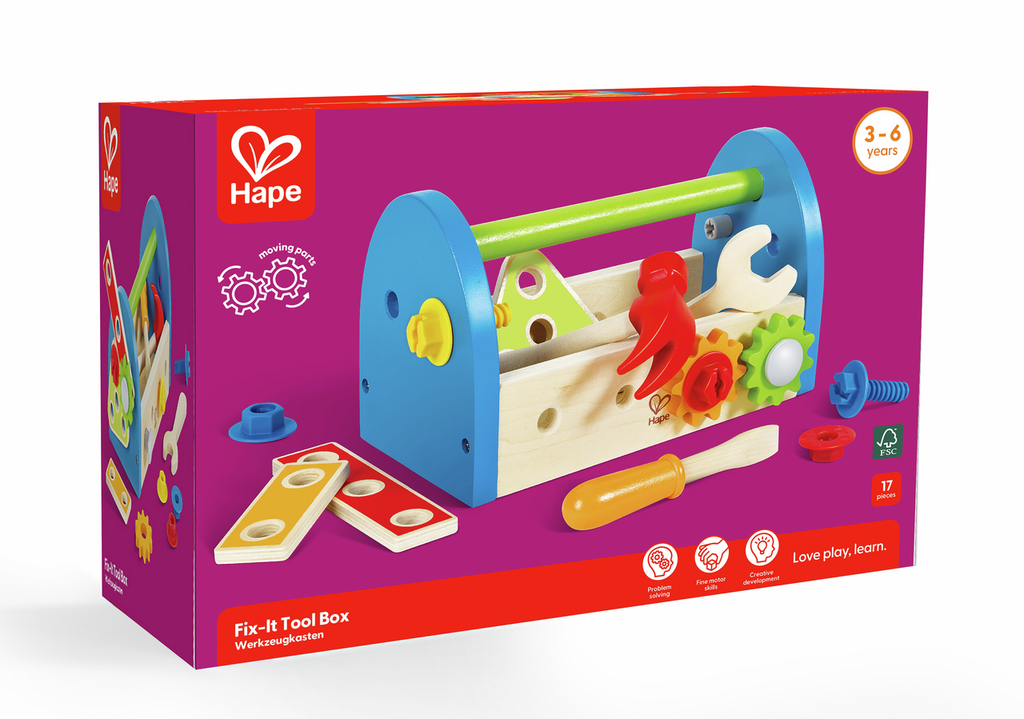 Es un juego de construcción con una caja de herramientas de madera y piezas tipo tornillos, tuercas, clavos, engranajes y conectores. Sirve para aprender a usar herramientas de forma segura (martillo, destornillador y llave inglesa), practicar el montaje de piezas y entender principios básicos de construcción y “ingeniería” a través del juego.