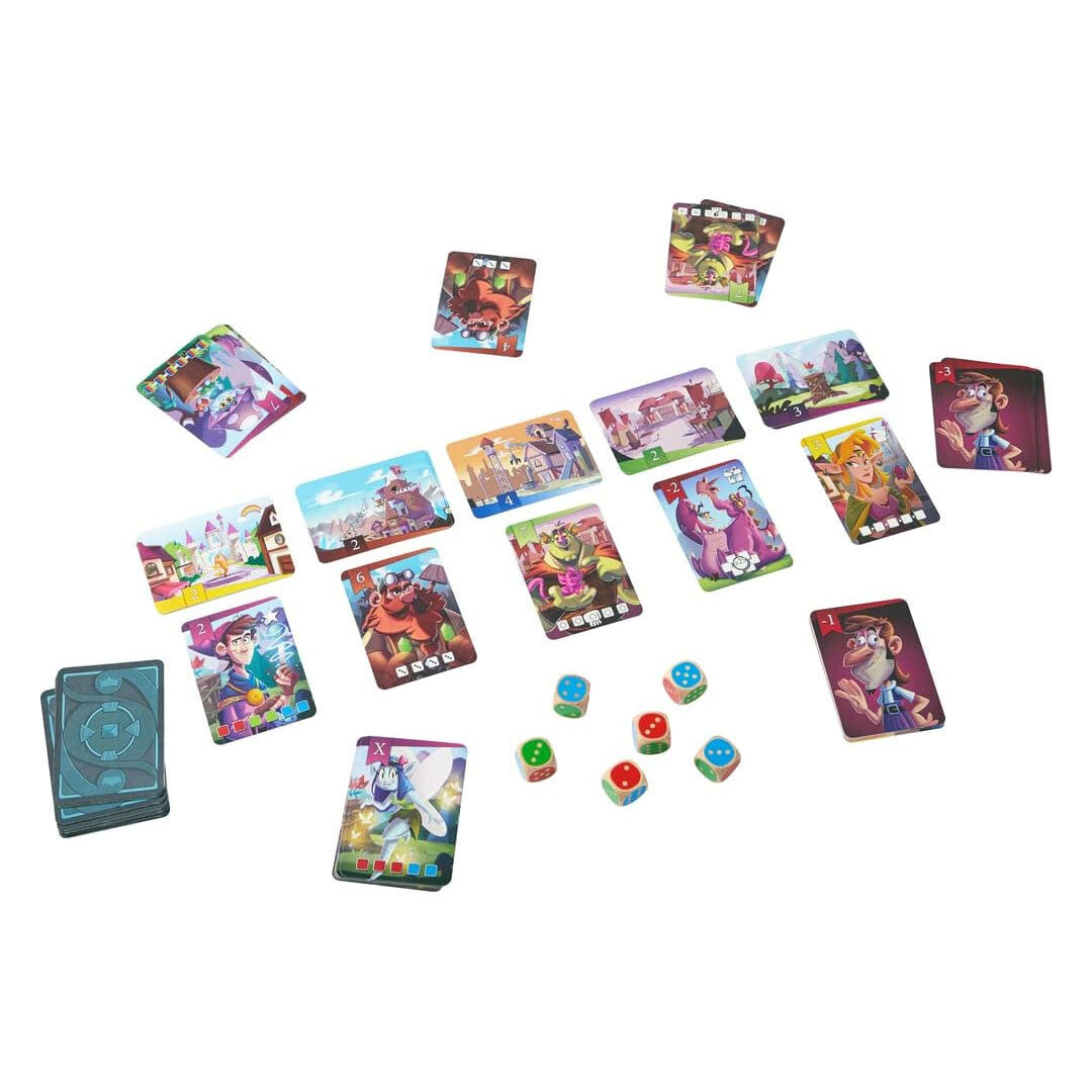 Juego de cartas y dados para 2–5 jugadores a partir de 8 años. Perfecto para familias y grupos de amigos que disfrutan de retos rápidos, con decisiones tácticas y giros inesperados.