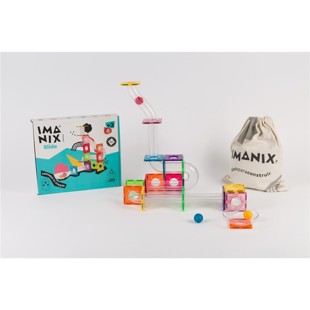 Un set de construcción magnético con piezas de distintos tamaños y colores para montar toboganes y canales por los que ruedan pelotas. Perfecto para peques curiosos que disfrutan del juego libre y experimental.