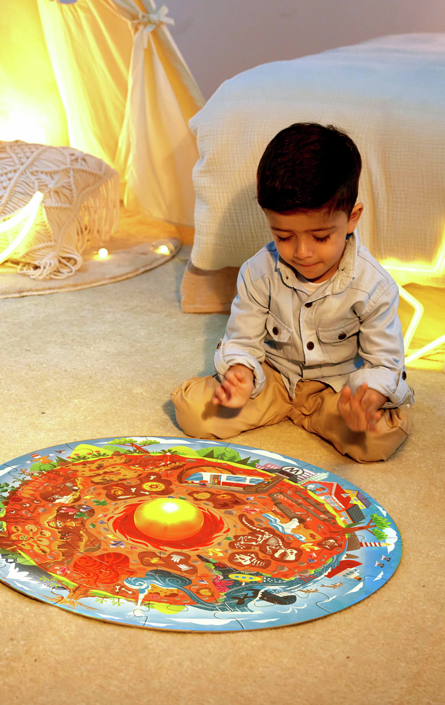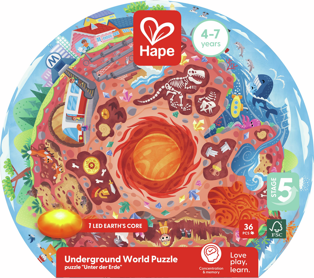 Puzle Infantil “Bajo Tierra” con Luz LED – 36 piezas. Explora el mundo subterráneo y descubre raíces, túneles, animales… ¡y hasta el núcleo terrestre, que se ilumina con una luz LED real! Un puzle educativo que convierte la curiosidad por la naturaleza en juego y aprendizaje.